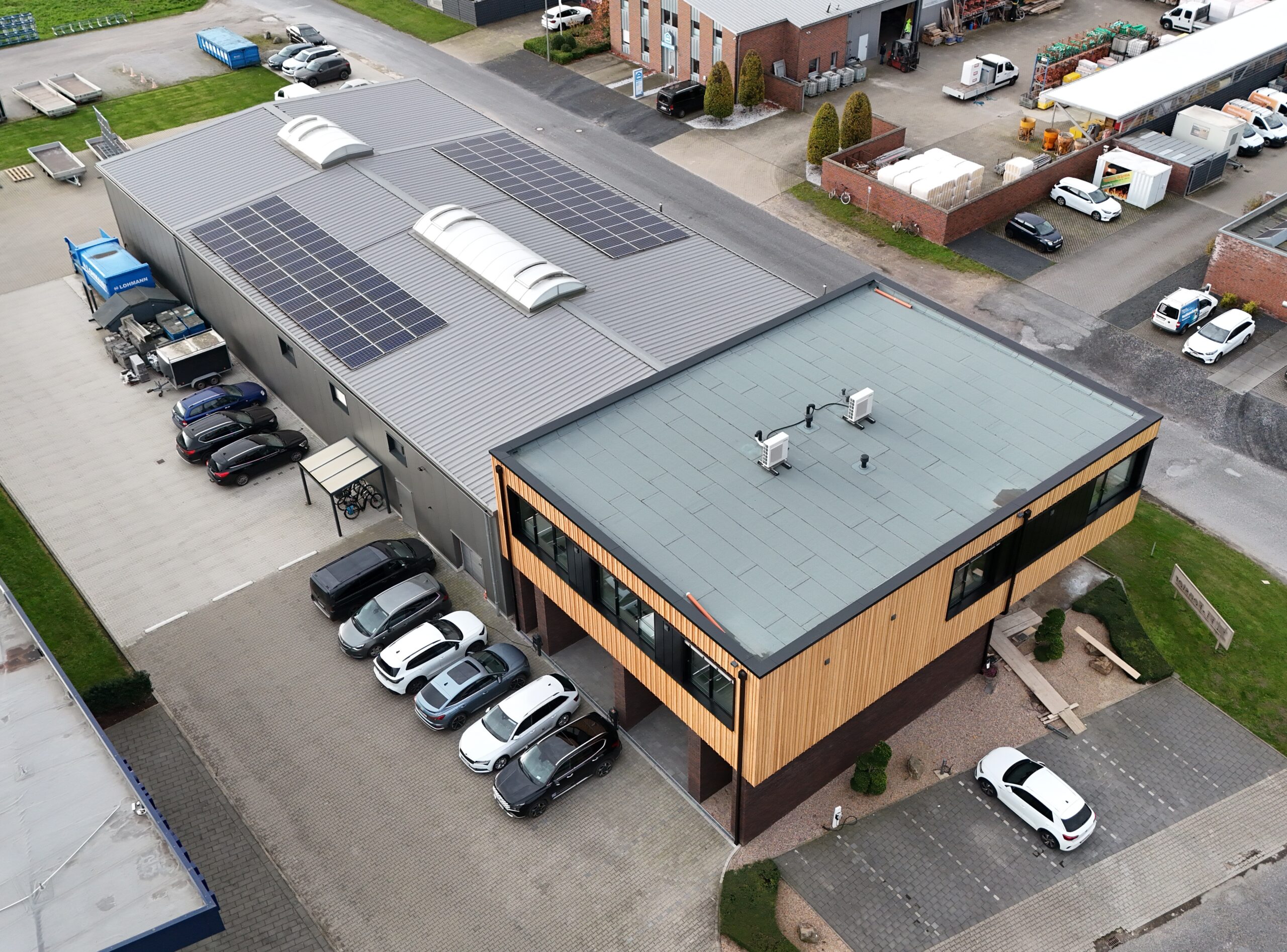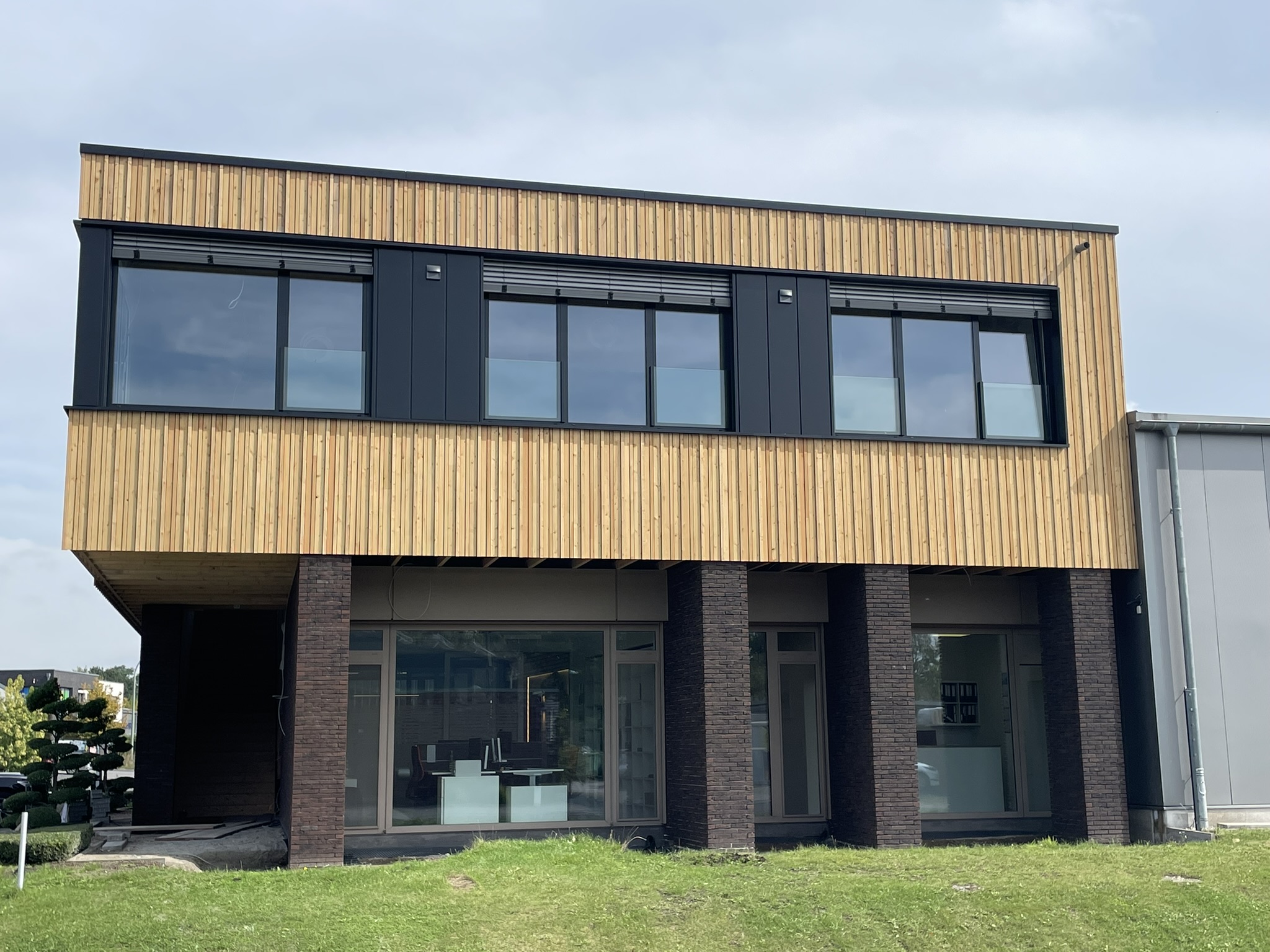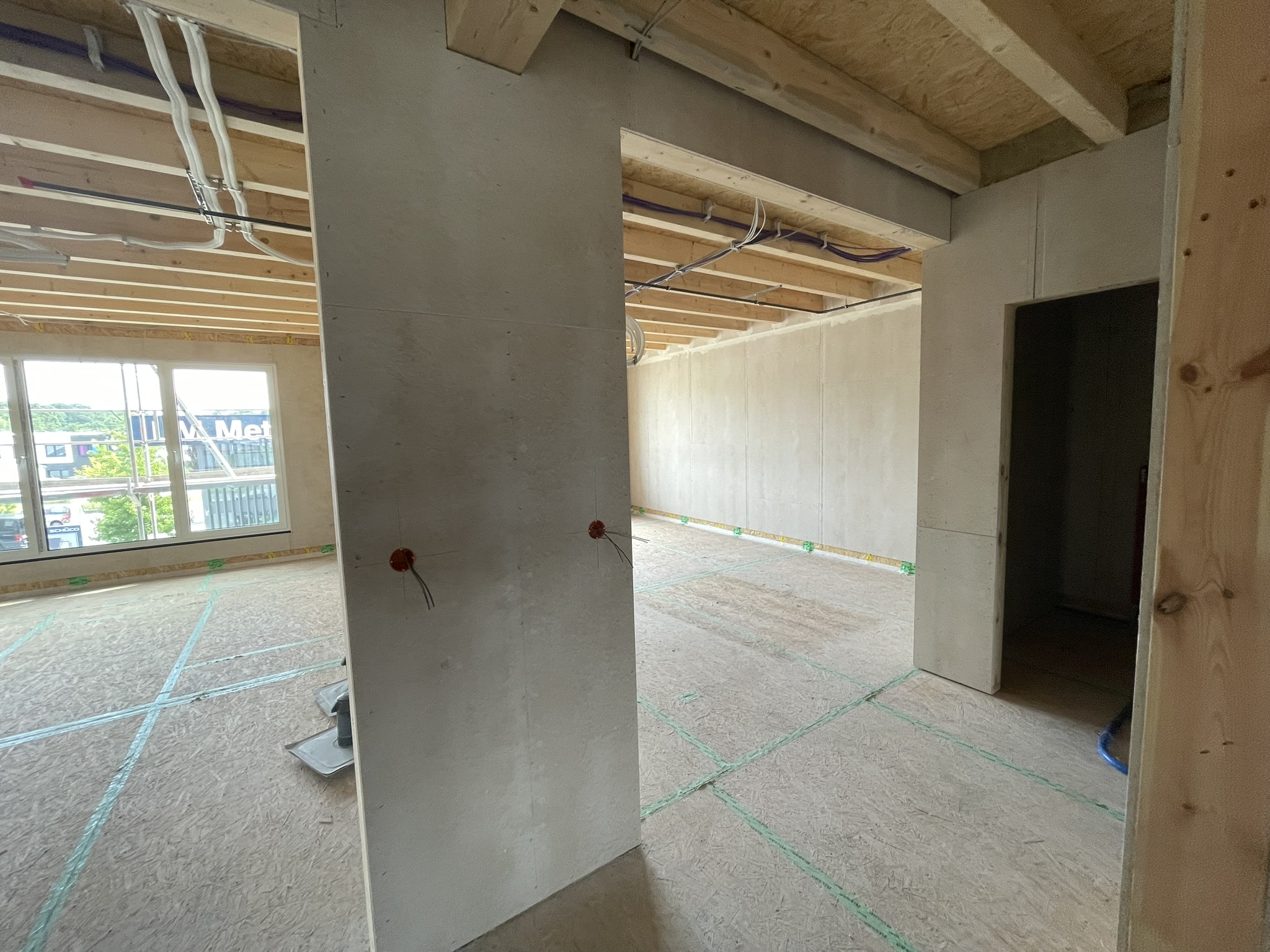 Aufstockung eines Bürogebäudes in hybrider Bauweise, als schwebendes Obergeschoss in Holzbauweise, auf einer Gebäude überspannenden Stahlkonstruktion.